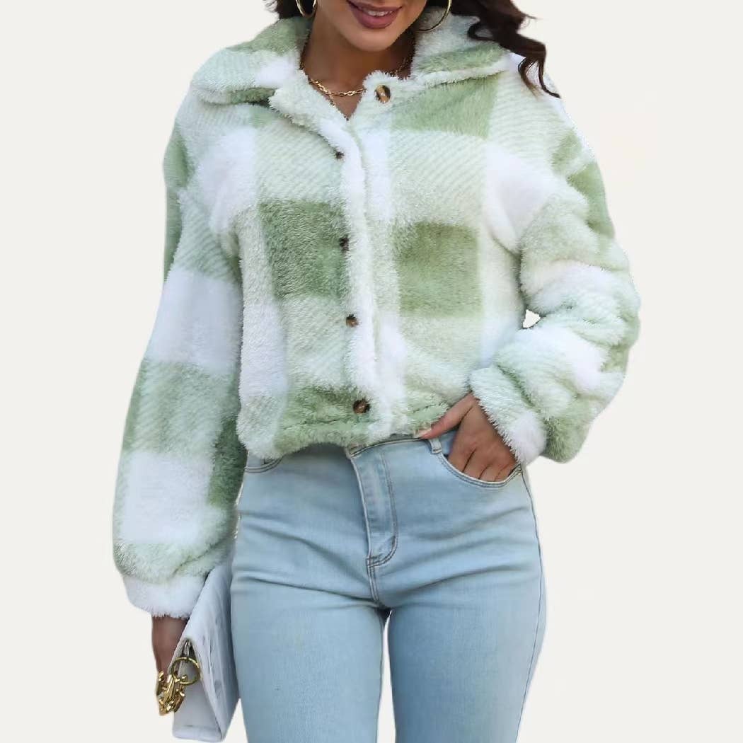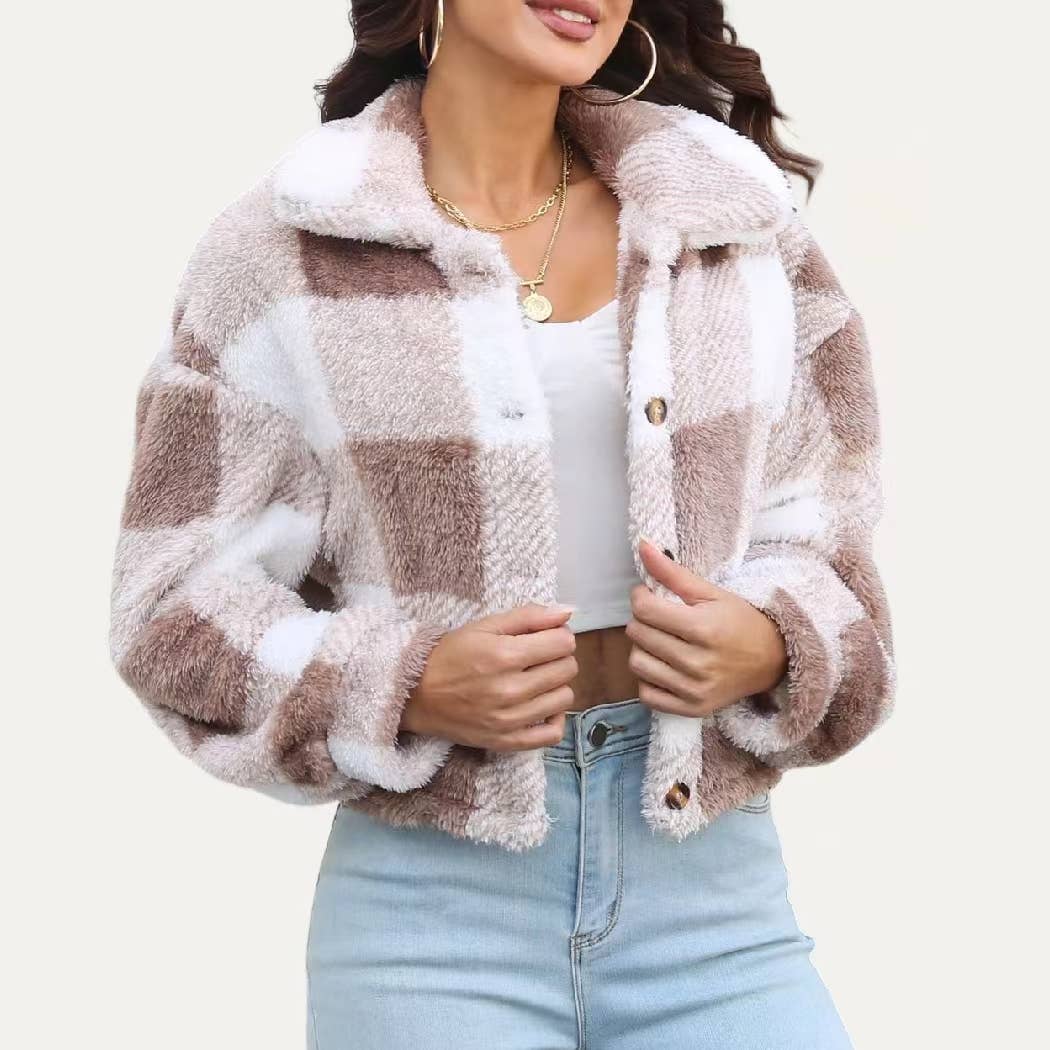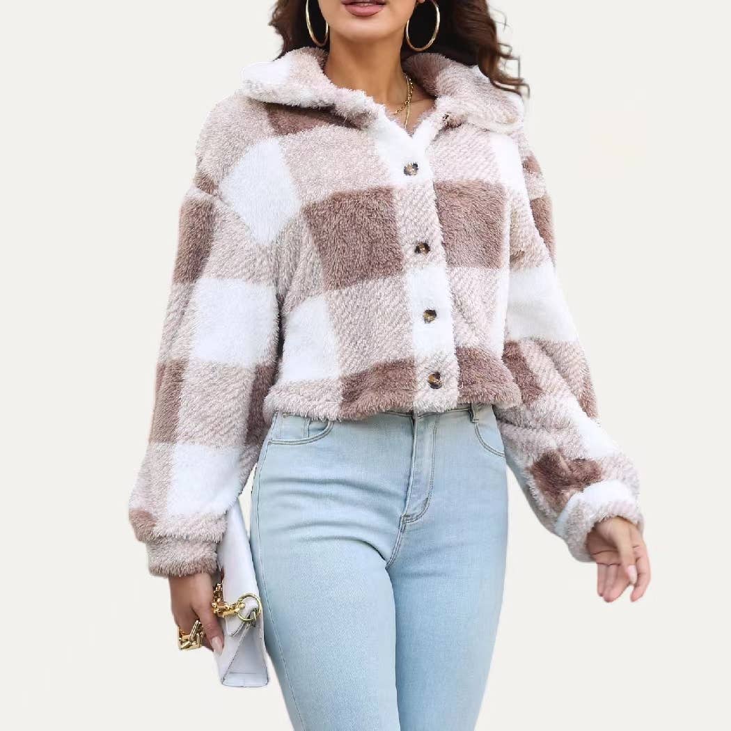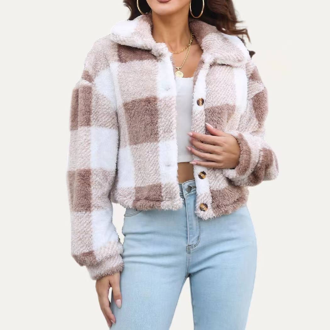 Chic Plaid Polar Fleece Collared Buttons Down Cropped Jacket