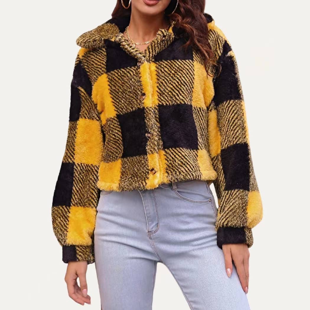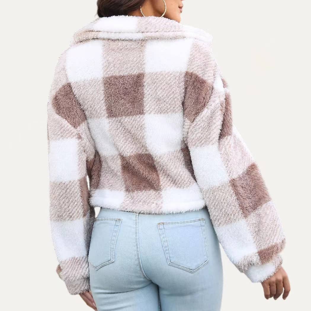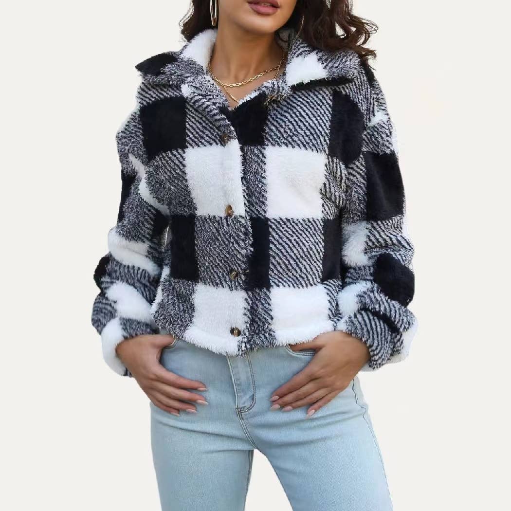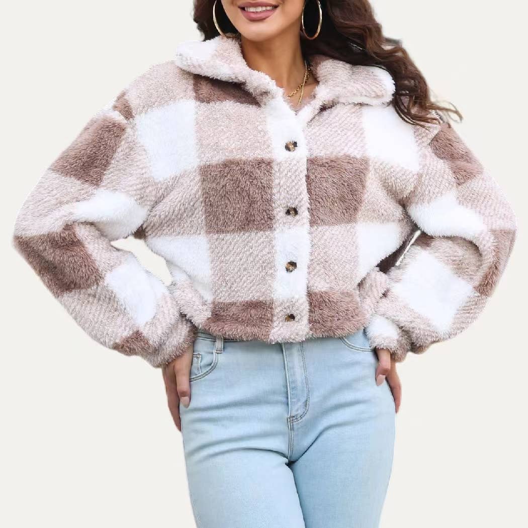 Chic Plaid Polar Fleece Collared Buttons Down Cropped Jacket