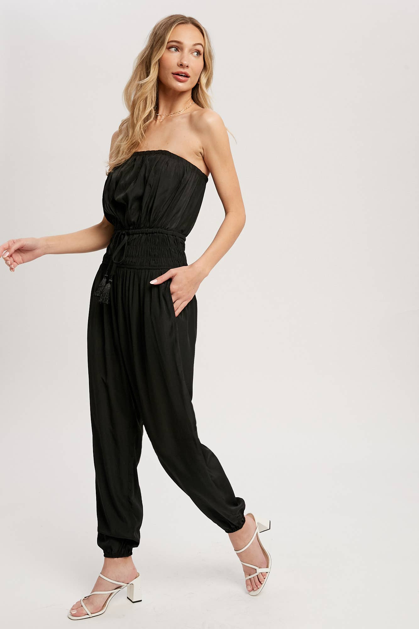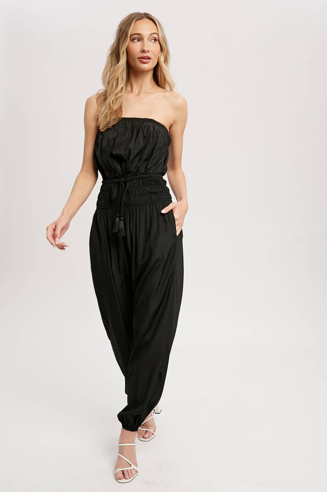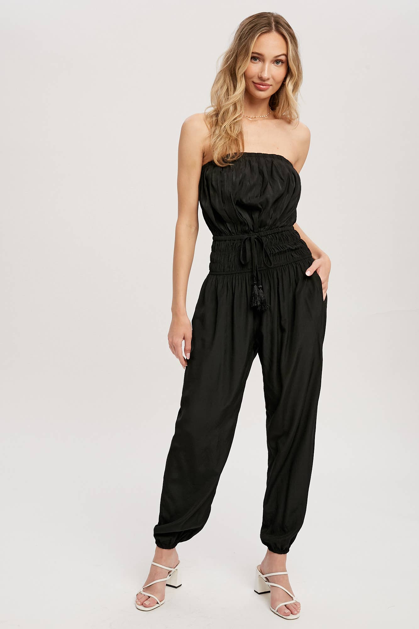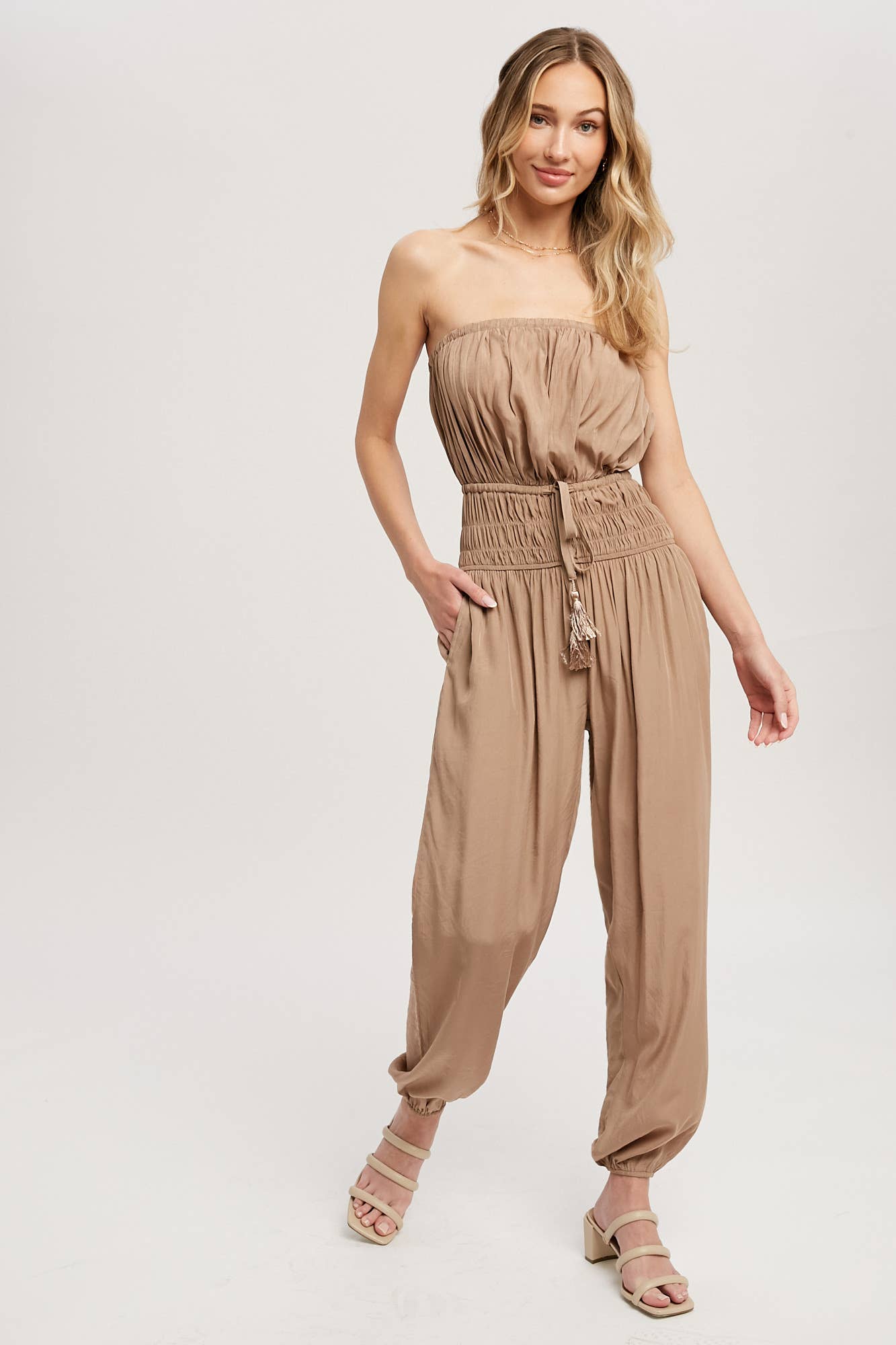 Woven jumpsuit featuring a tube neckline with pleated details, smocked elastic cinched waist with tassel, elastic leg opening, side pockets. This strapless jumpsuit is the perfect on-the-go summer piece.