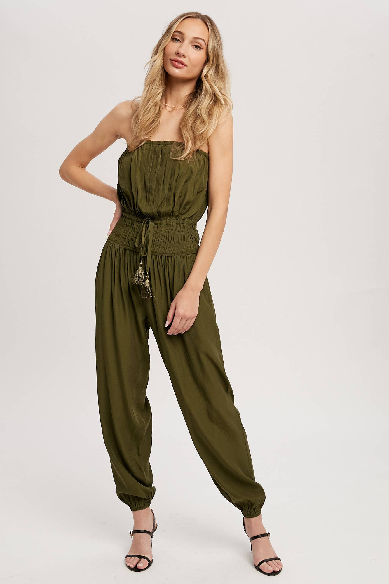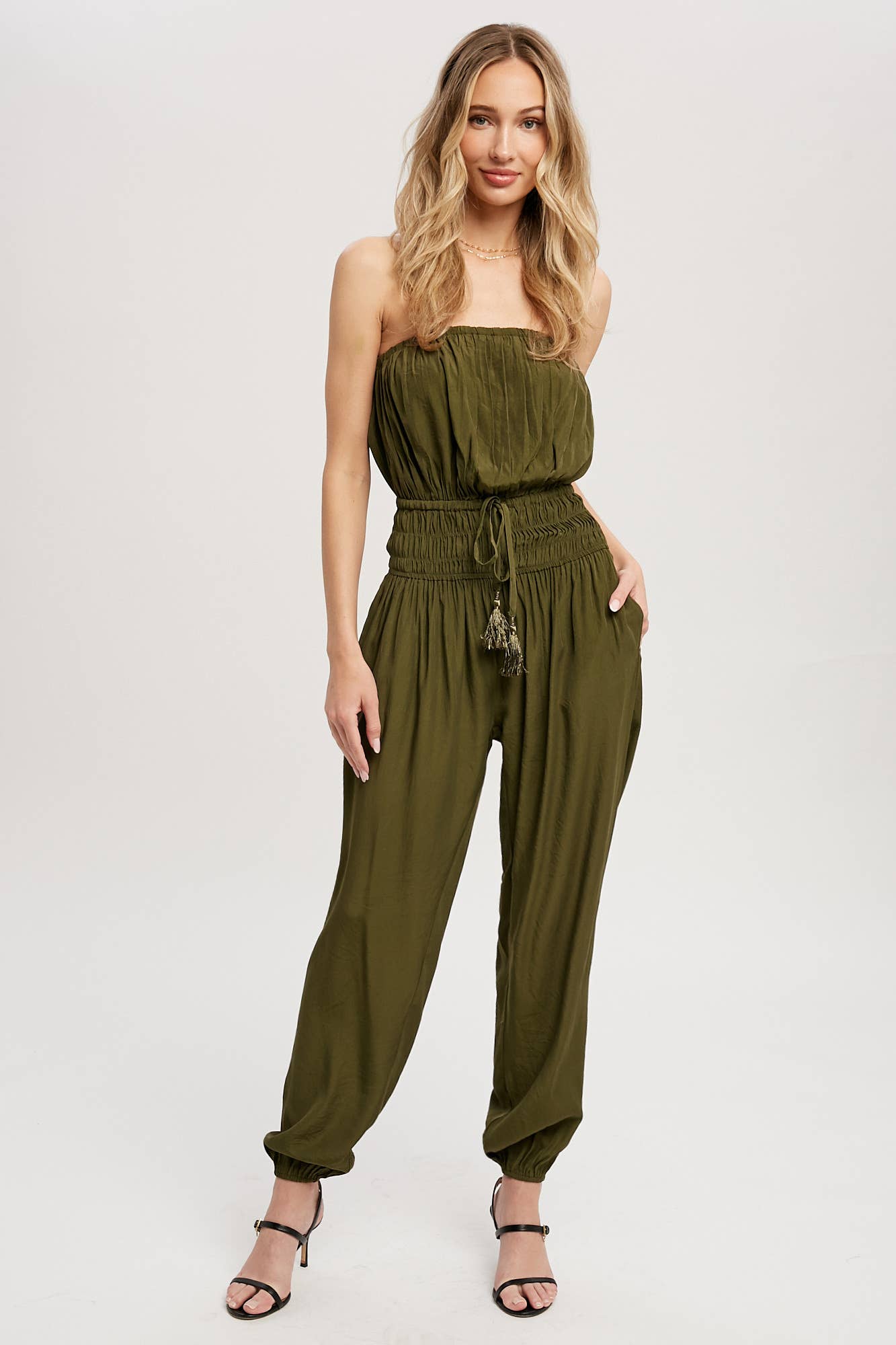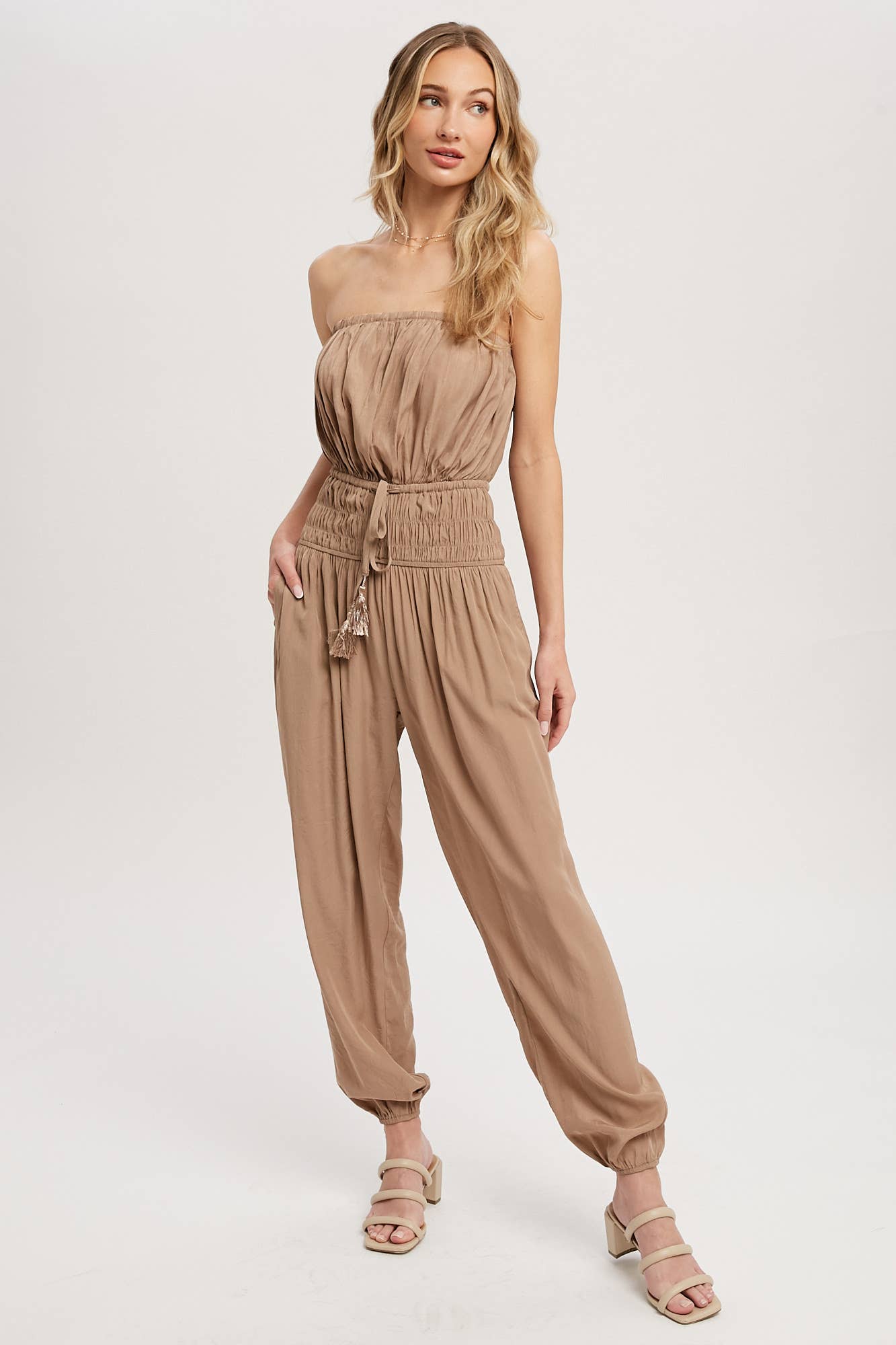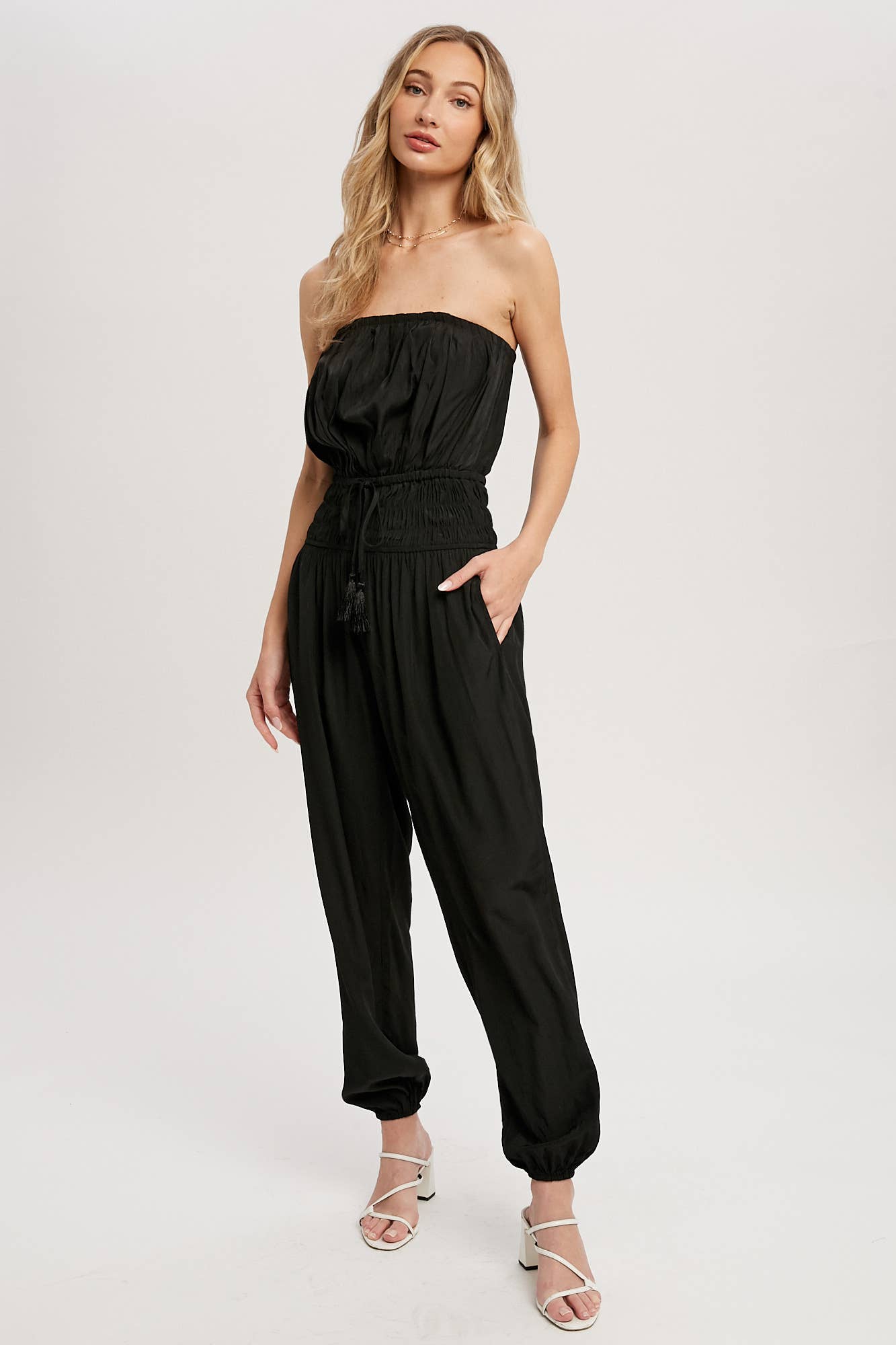 Woven jumpsuit featuring a tube neckline with pleated details, smocked elastic cinched waist with tassel, elastic leg opening, side pockets. This strapless jumpsuit is the perfect on-the-go summer piece.
