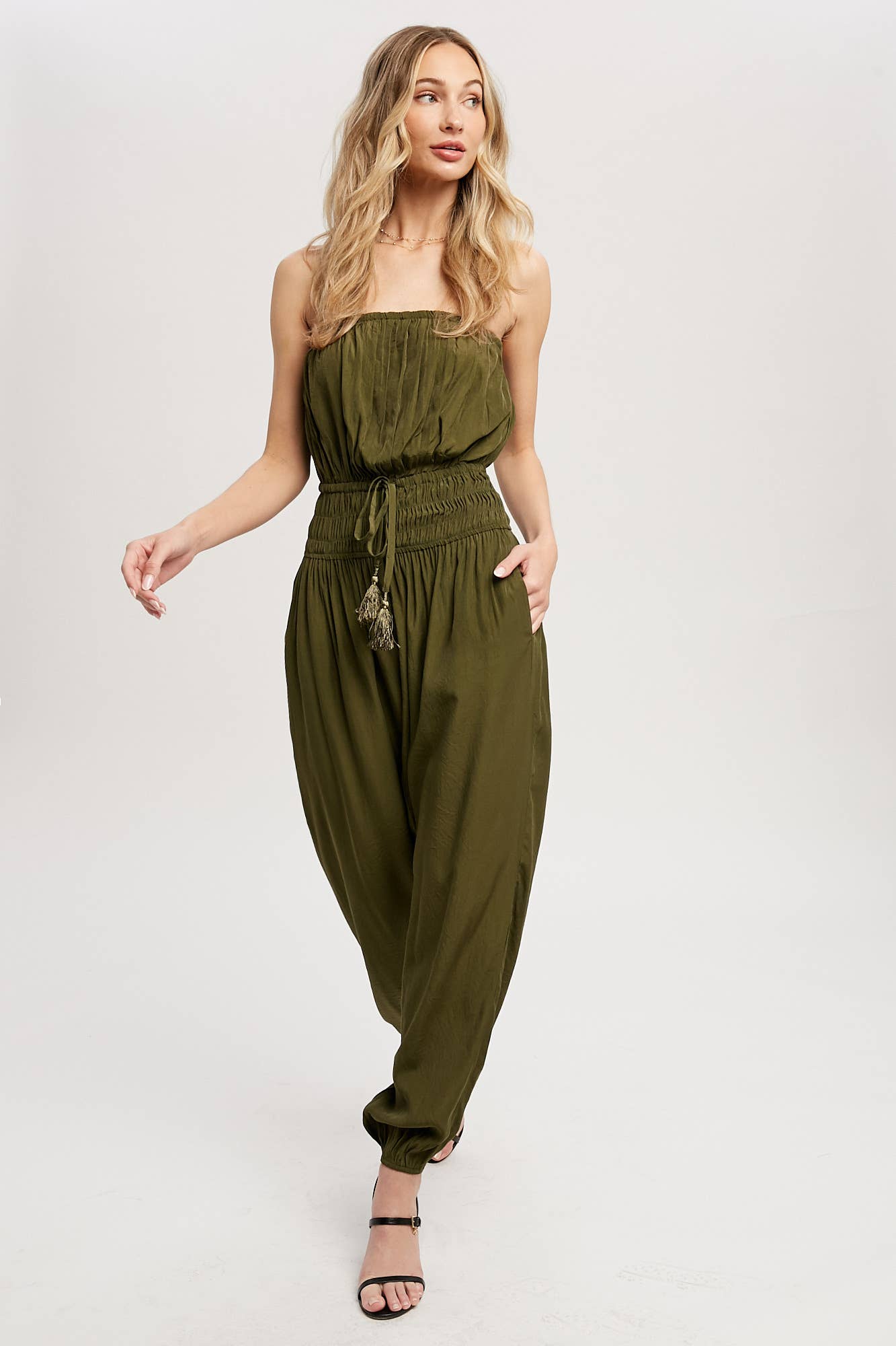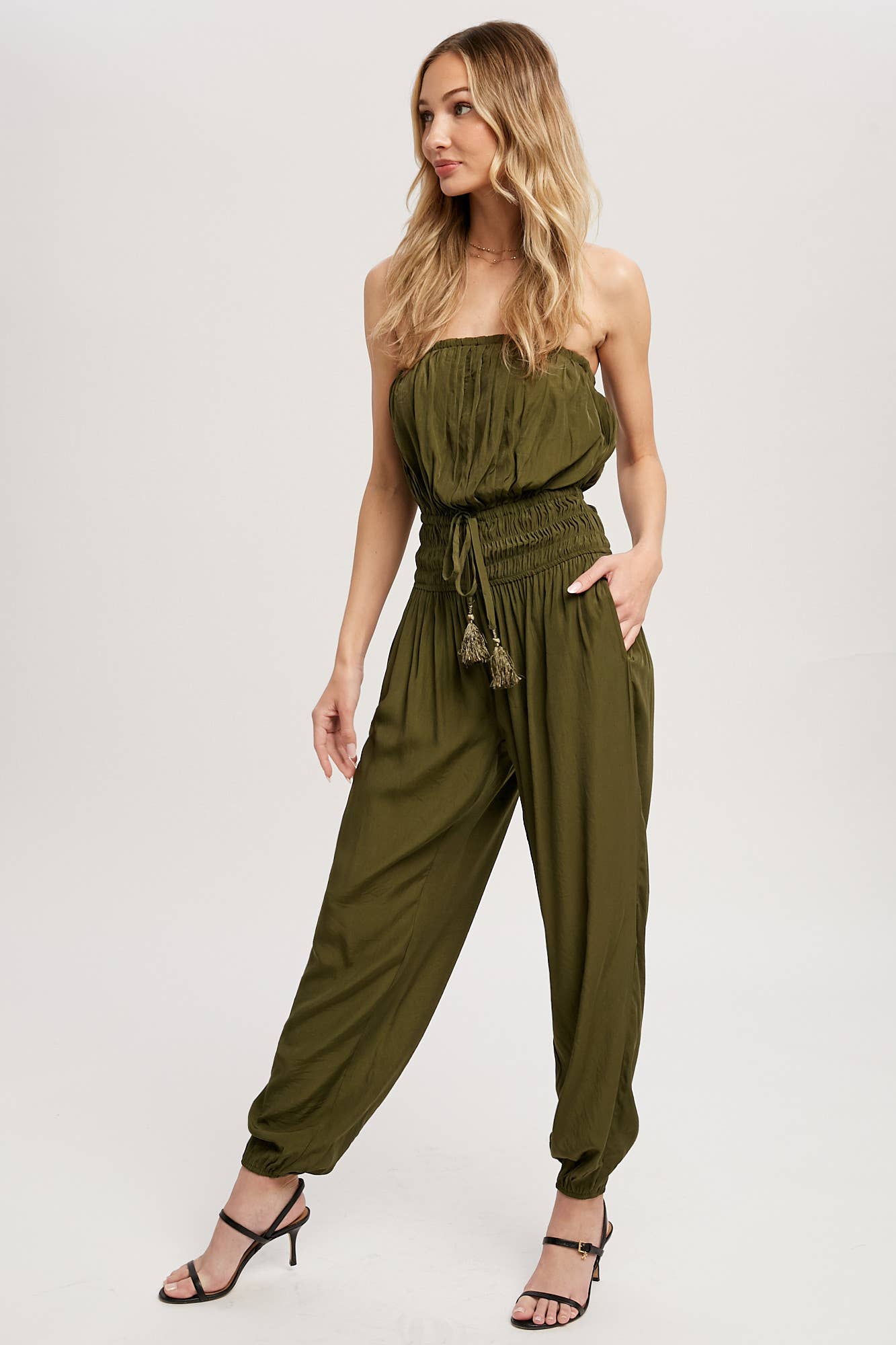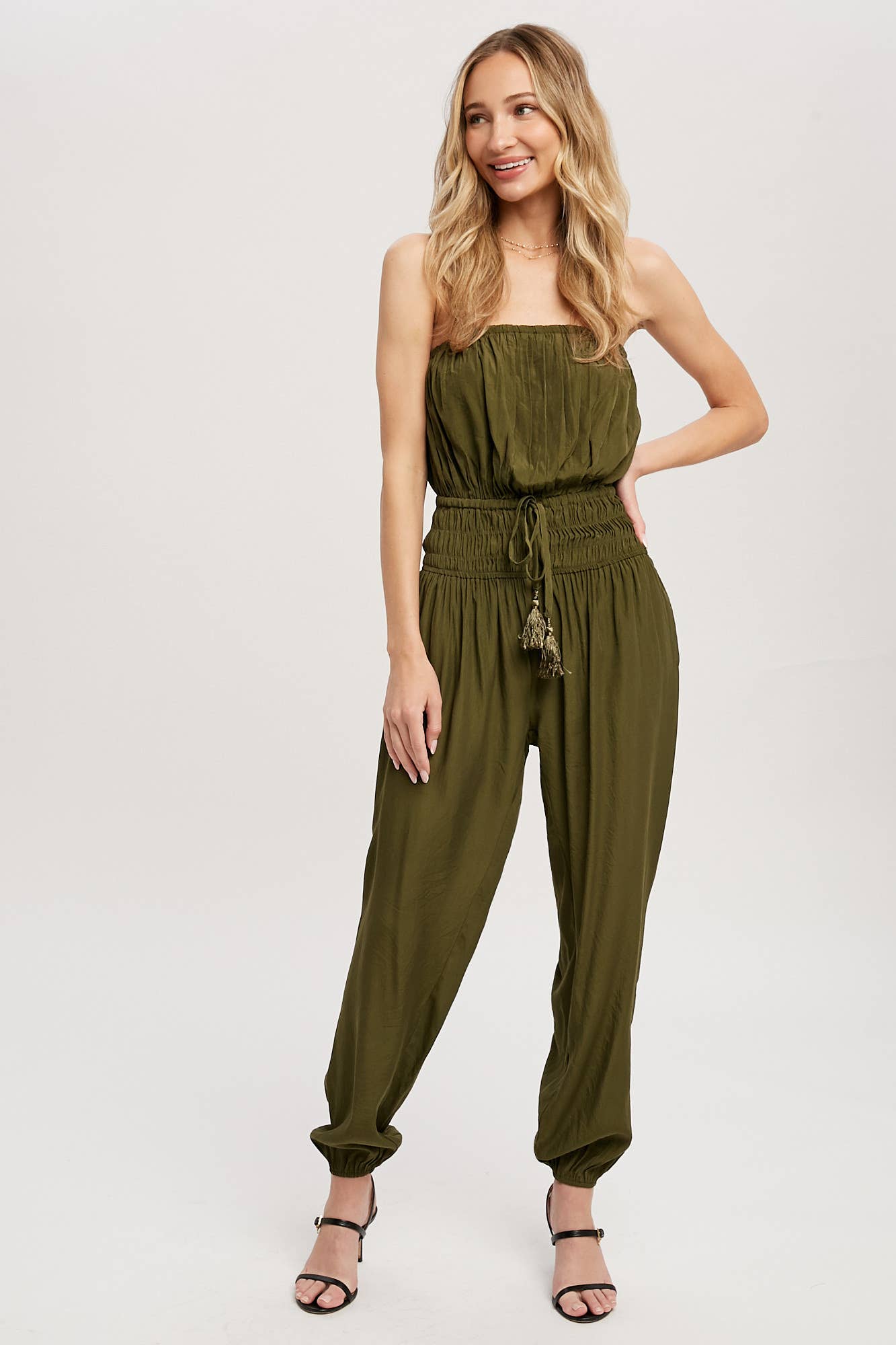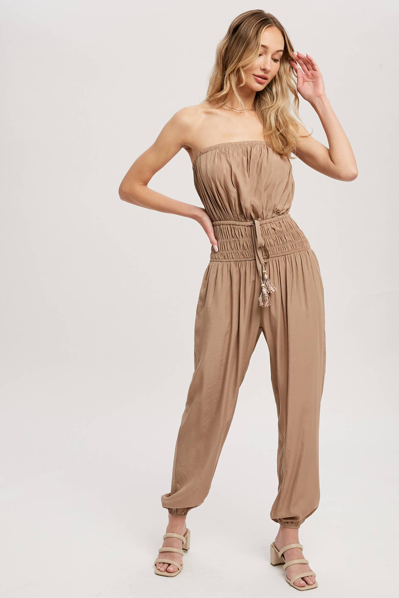 Woven jumpsuit featuring a tube neckline with pleated details, smocked elastic cinched waist with tassel, elastic leg opening, side pockets. This strapless jumpsuit is the perfect on-the-go summer piece.