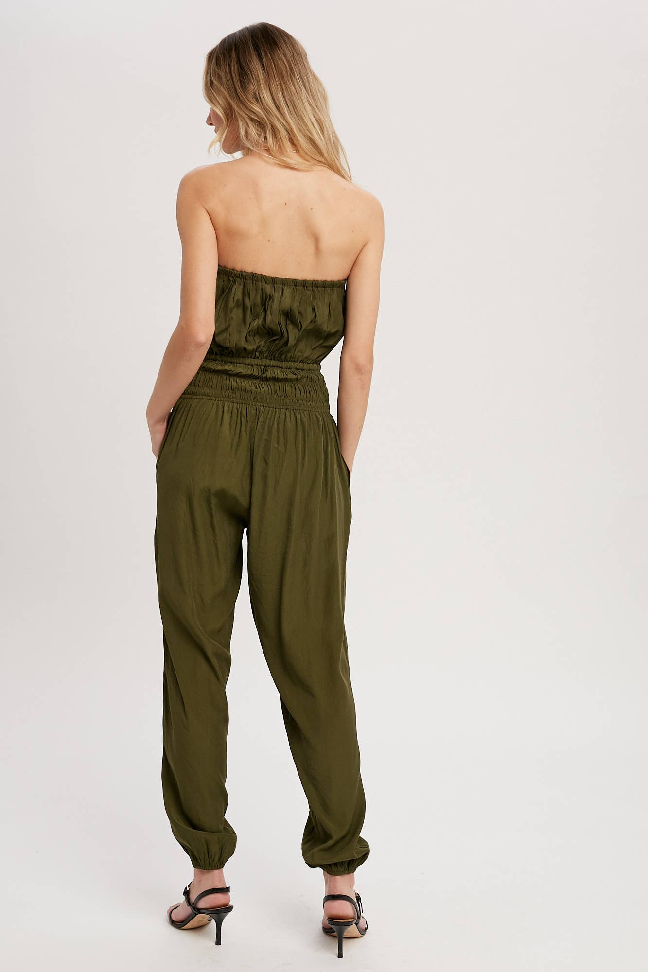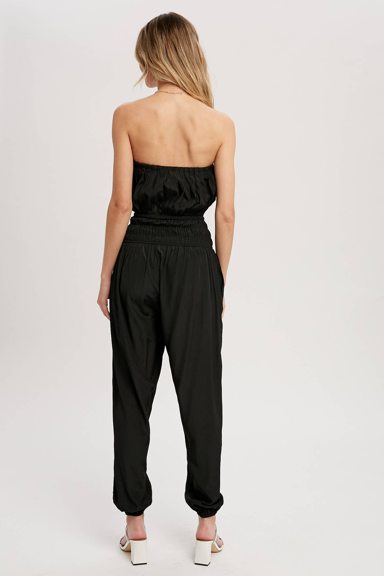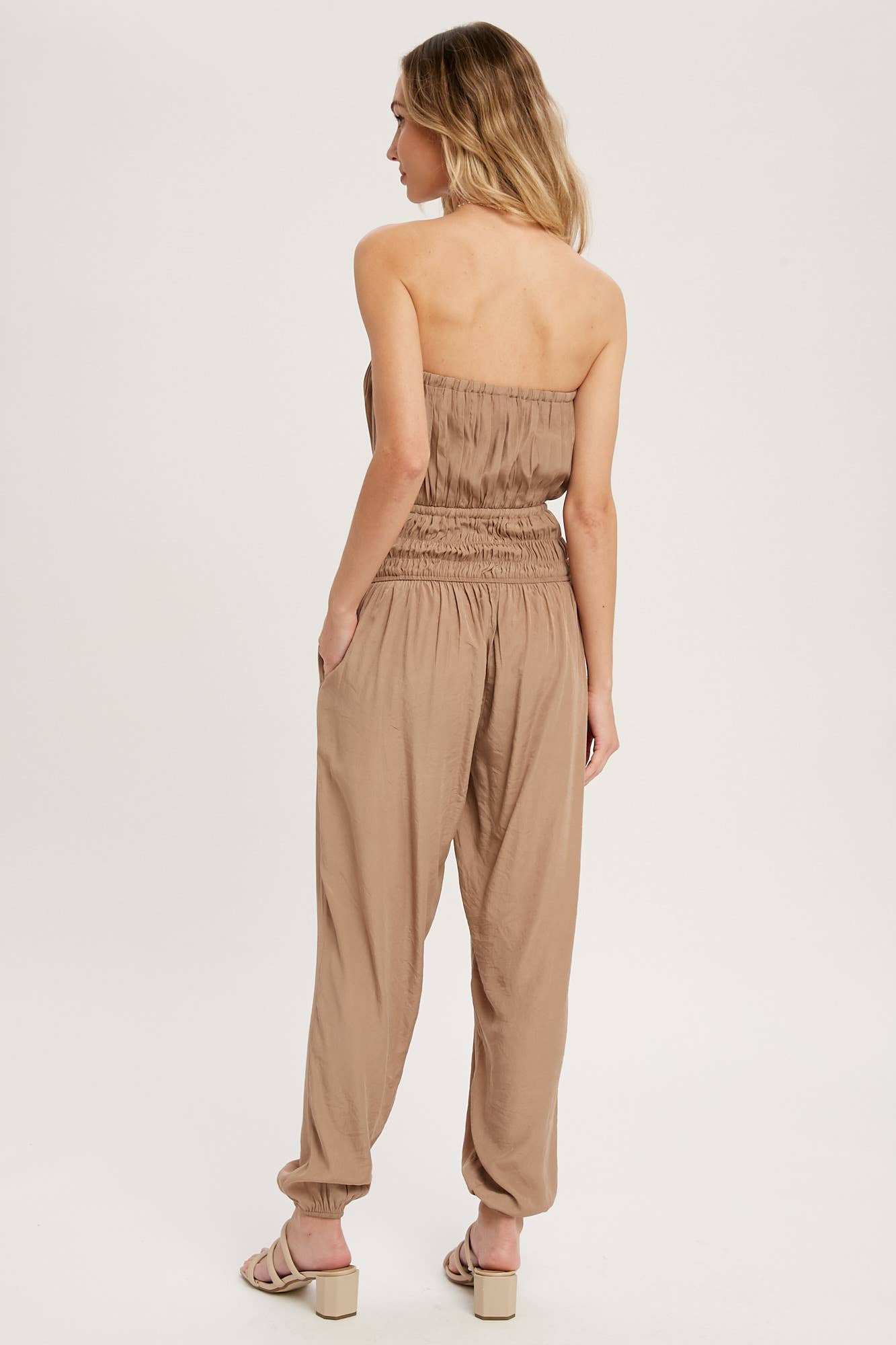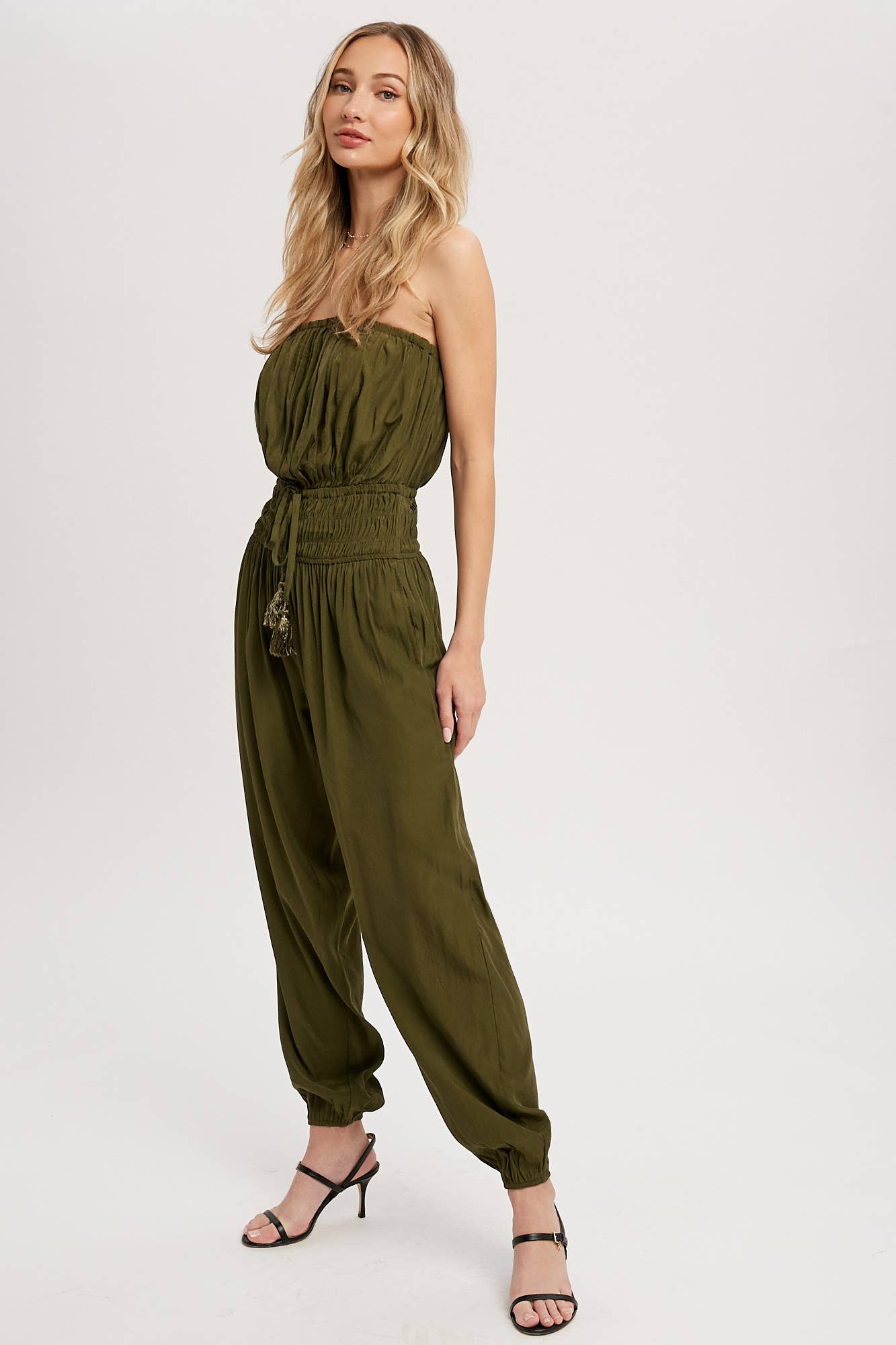 Woven jumpsuit featuring a tube neckline with pleated details, smocked elastic cinched waist with tassel, elastic leg opening, side pockets. This strapless jumpsuit is the perfect on-the-go summer piece.