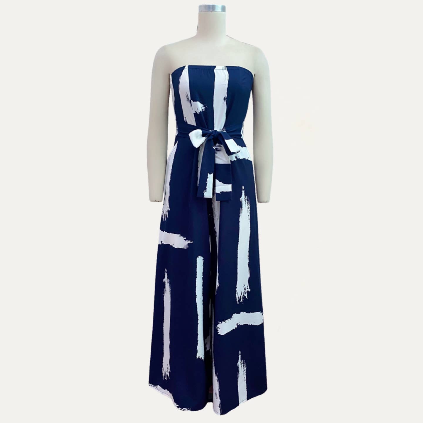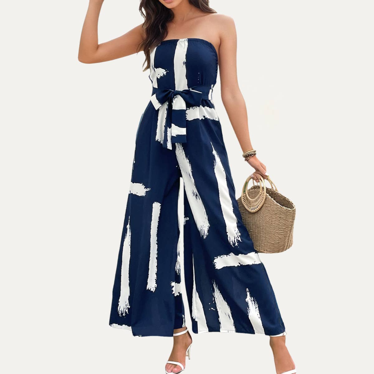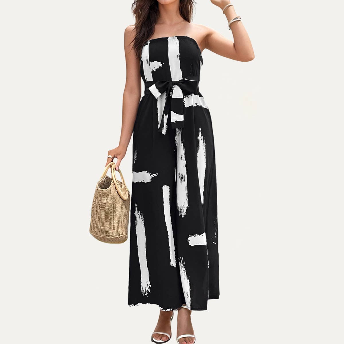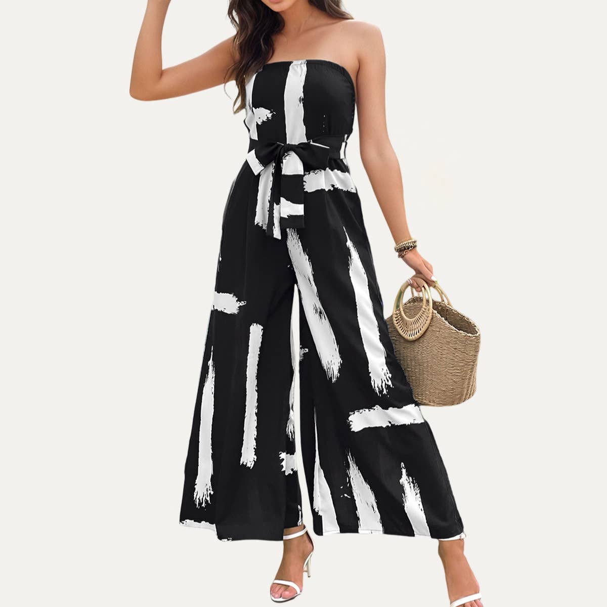 *FEATURES: Lightweight Woven Fabric/Elastic Off-the-Shoulder Neckline/Sleeveless/Zipper at Back/High Waist/Removable Waist Sash/Wide-Leg Pants/Jumpsuit
